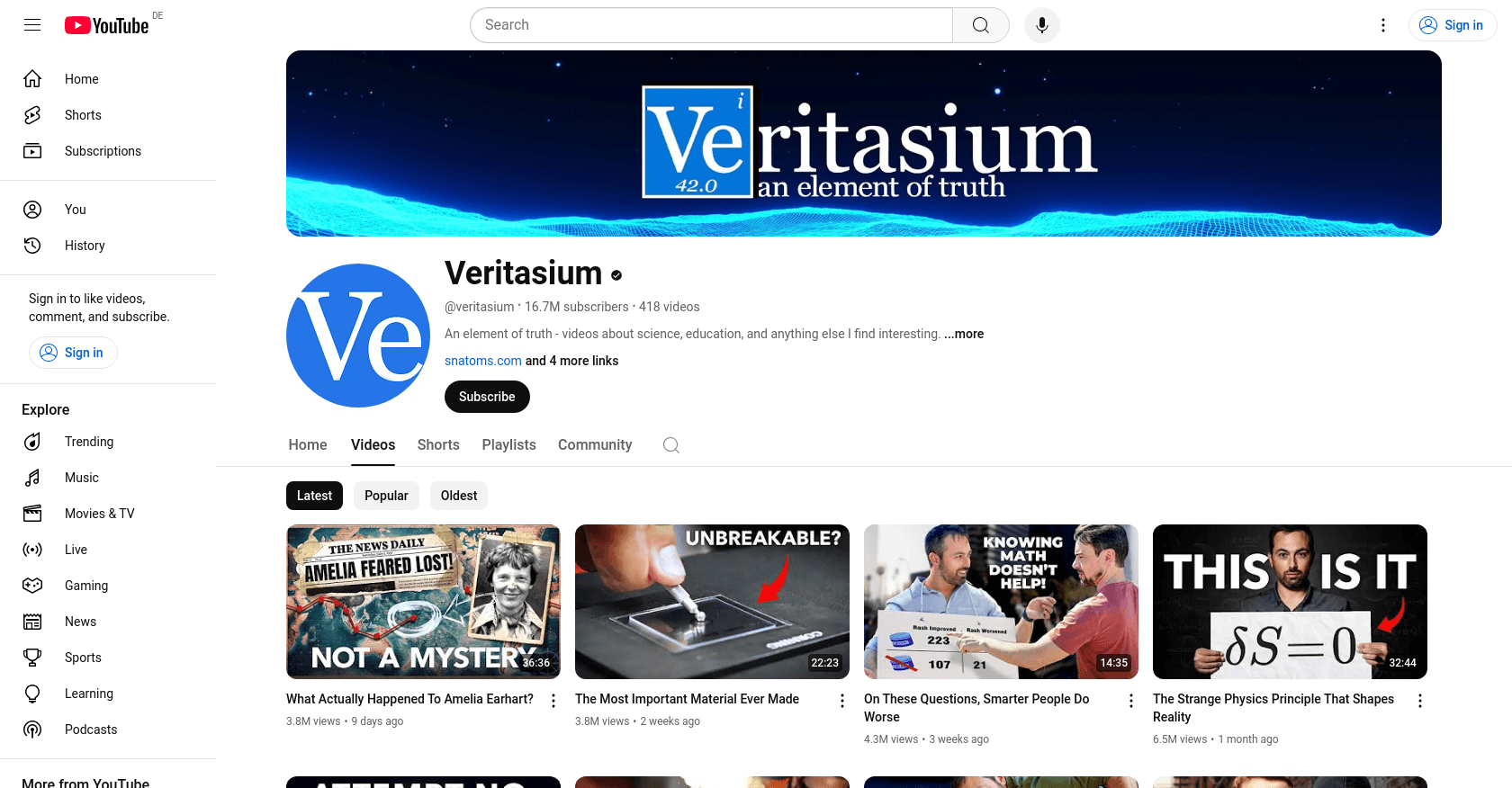 Veritasium, hosted by Derek Muller, is a popular YouTube channel that delves into science, education, and other intriguing topics. Derek Muller joined YouTube on July 21, 2010, and has since amassed a substantial following. For more information, visit Veritasium.