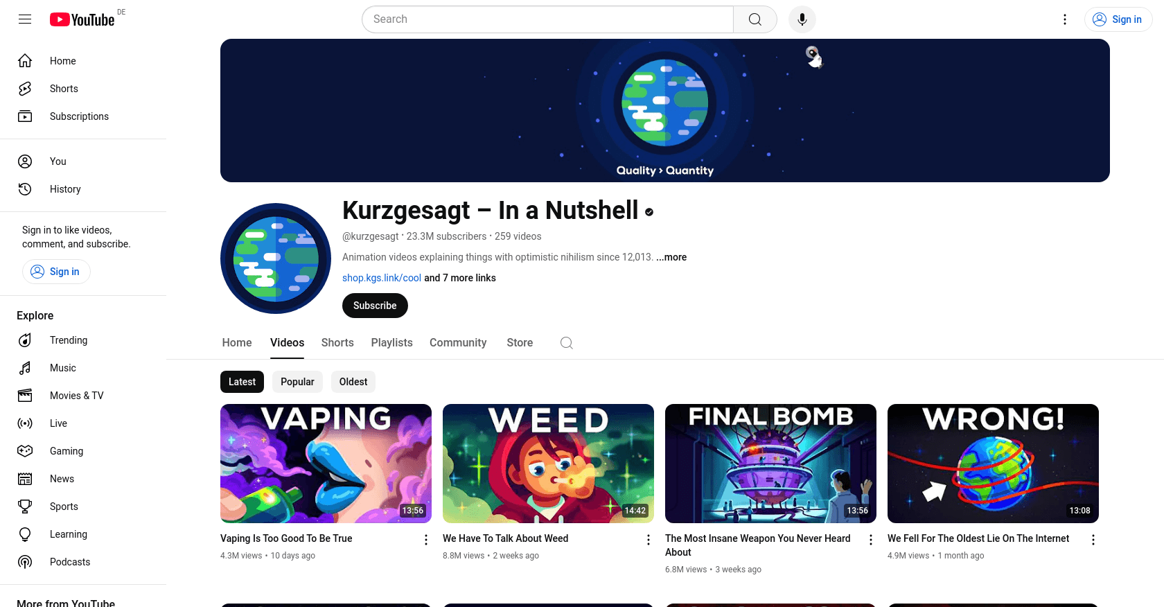 Kurzgesagt – In a Nutshell, founded by Philipp Dettmer, is a German animation studio and YouTube channel known for its educational content on science, technology, and philosophy. The channel, which joined YouTube on July 10, 2013, creates animation videos that explain complex topics with an approach they call "optimistic nihilism." For more information, visit Kurzgesagt – In a Nutshell's YouTube Channel.