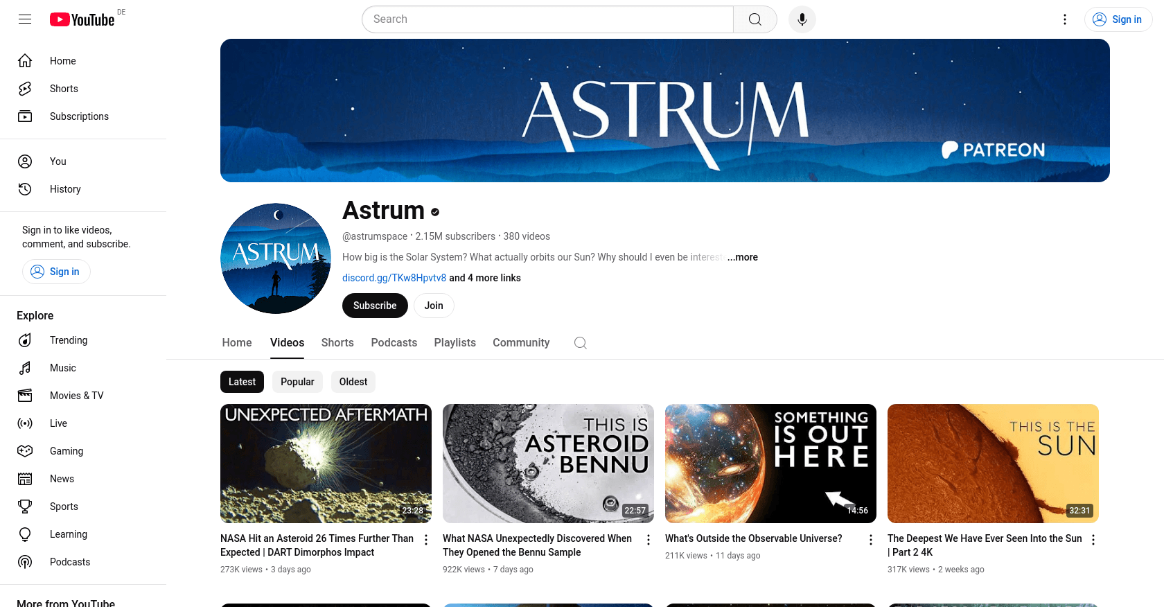 Astrum, a YouTube channel dedicated to space and astronomy, joined the platform on October 09, 2013. The channel, which has amassed 2.17 million subscribers, focuses on answering questions about the Solar System, the Sun, and space in general. For more information, visit Astrum's YouTube Channel.