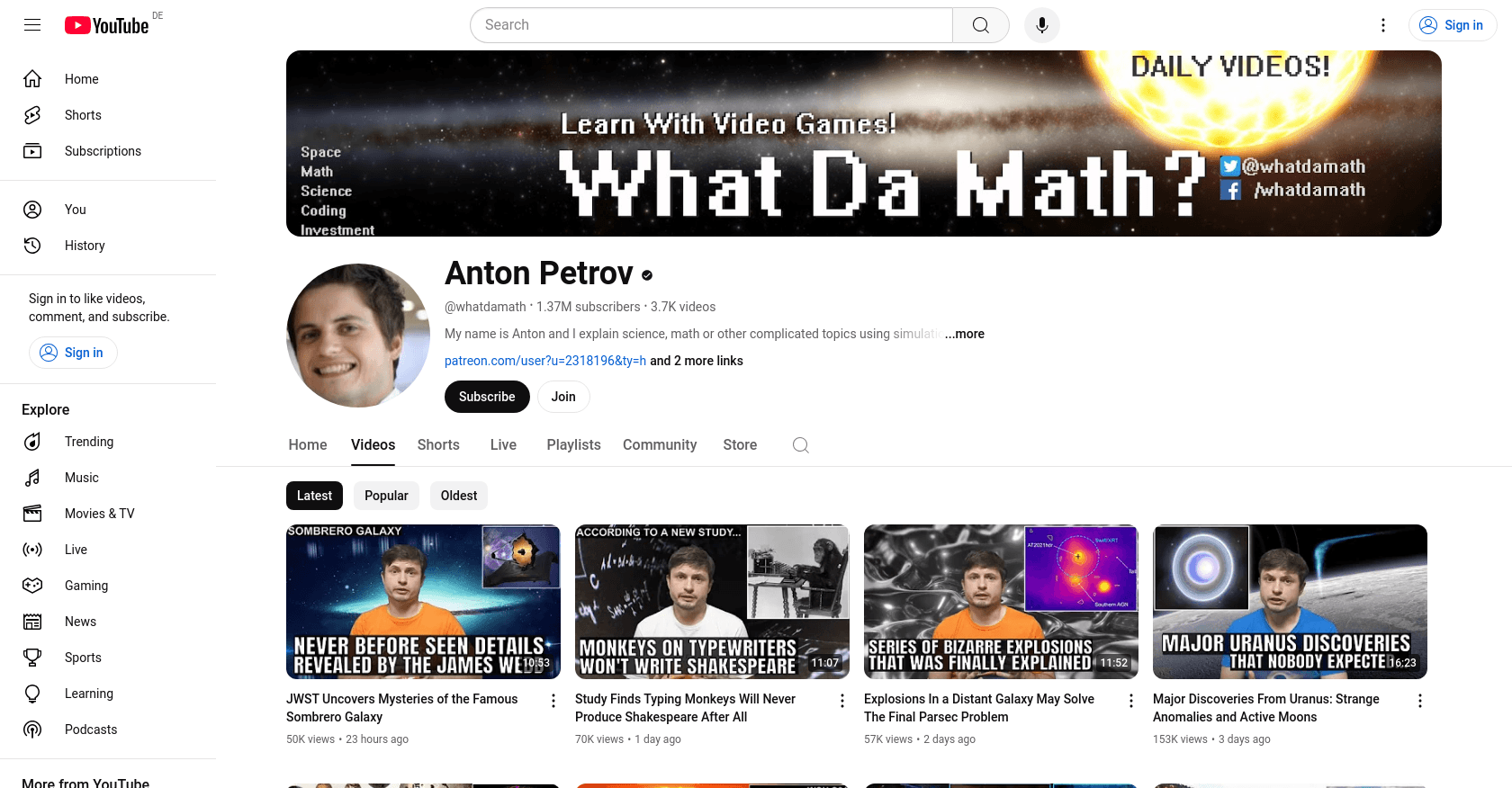 Anton Petrov, known for his educational YouTube channel, joined the platform on September 29, 2011. His content focuses on explaining science, math, and other complex topics using simulations and video games. With over 1.37 million subscribers, Anton has become a prominent figure in the educational space on YouTube. For more information, visit Anton Petrov's YouTube Channel.