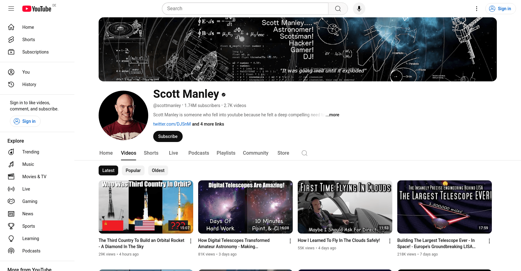 Scott Manley, whose real name is Scott Manley, is a YouTube star known for his scientific and gameplay videos. He joined YouTube on July 08, 2006, initially focusing on teaching orbital mechanics and rocket science through games like Kerbal Space Program. Over time, his content has evolved to cover a broader range of science topics, making him a prominent figure in the online science community. For more information, visit Scott Manley's YouTube Channel.