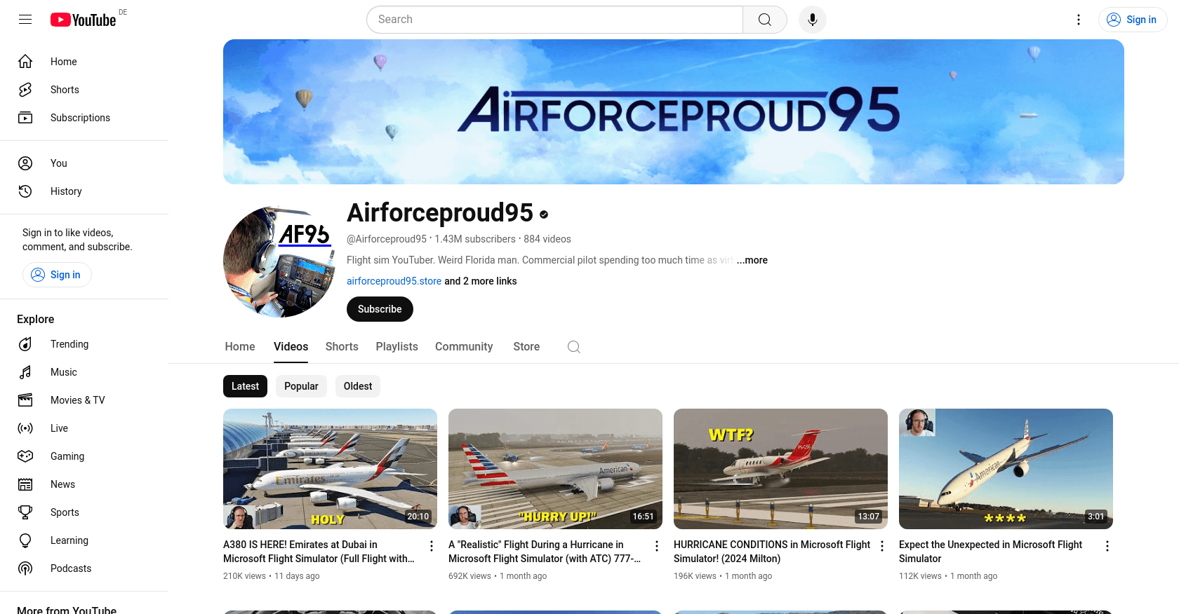 Airforceproud95, a popular YouTube creator known for his flight simulation videos, is based in Florida, United States.