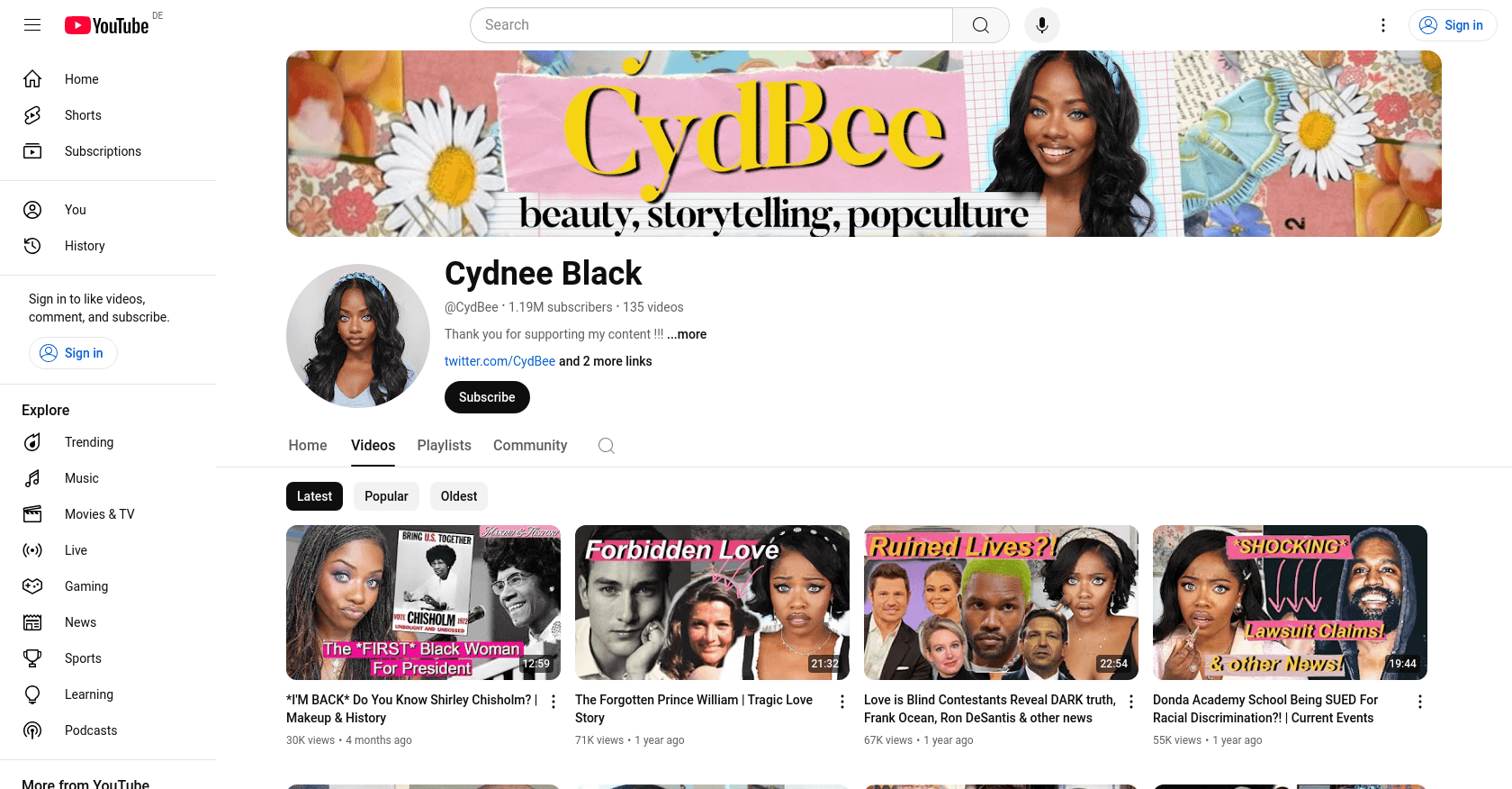 The audience for Cydnee Black primarily consists of young adults and teenagers, predominantly female, who are passionate about beauty, makeup, and personal development. For instance, her playlist "MAKEUP & HISTORYYYYY" attracts viewers interested in the intersection of beauty and historical events, while her video "How I Grew My Hair Back After a Big Chop" resonates with those seeking hair care and styling advice.
