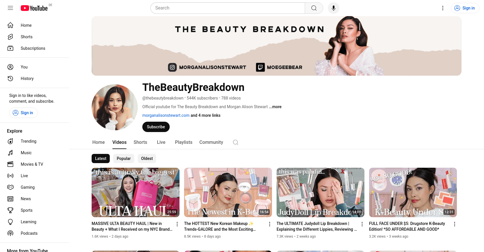 Morgan Alison Stewart, known as The Beauty Breakdown, is a prominent YouTube content creator who focuses on beauty, skincare, and makeup, particularly emphasizing Korean beauty products. She joined the platform on February 20, 2014, and has since garnered a substantial following. For more about her content, visit The Beauty Breakdown's YouTube Channel.
