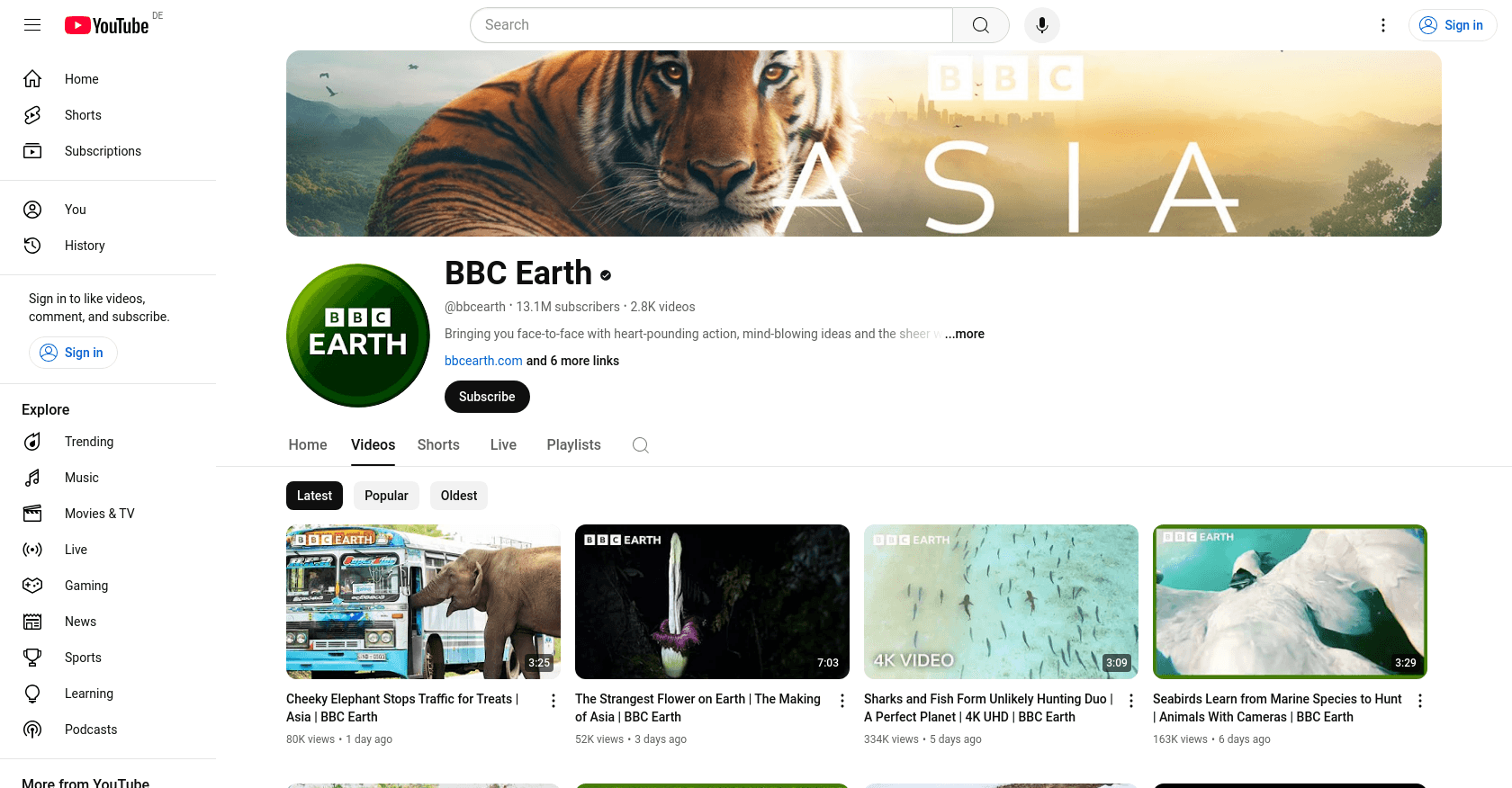 BBC Earth, a YouTube channel under the brand name used by BBC Studios, joined the platform on February 25, 2009. The channel features a variety of nature and wildlife documentaries, including series narrated by Sir David Attenborough. For more information, visit the BBC Earth YouTube Channel.