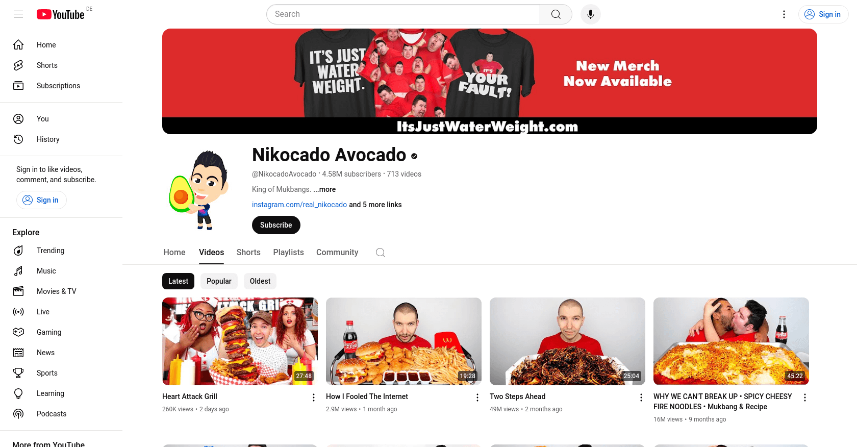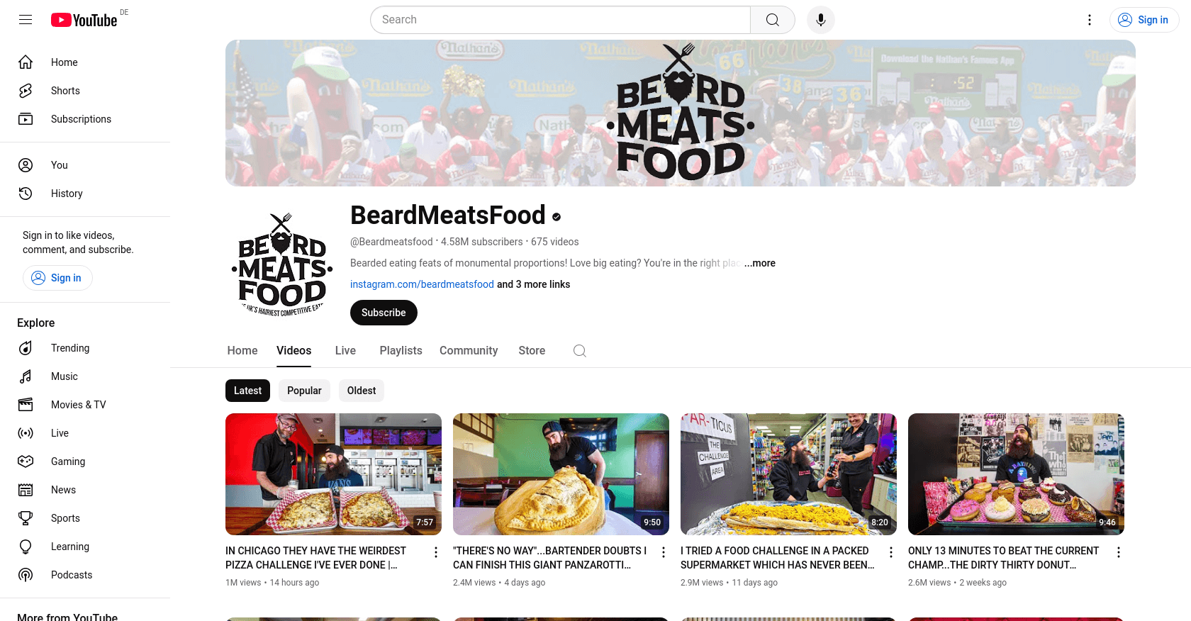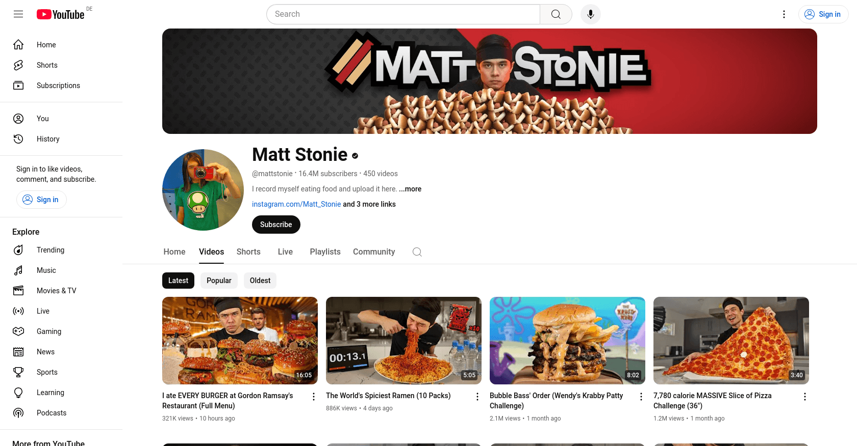 His videos frequently feature popular food challenges, such as eating every burger at Gordon Ramsay's restaurant or tackling the world's spiciest ramen.