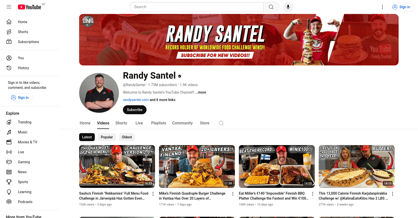 Randy Santel's audience primarily consists of food enthusiasts and competitive eating fans who enjoy watching extreme food challenges from around the world. For instance, his video "4 Times I've Been CHEATED By Food Challenge Restaurants!!" has garnered 11 million views, indicating a strong interest in high-stakes eating spectacles among his viewers.