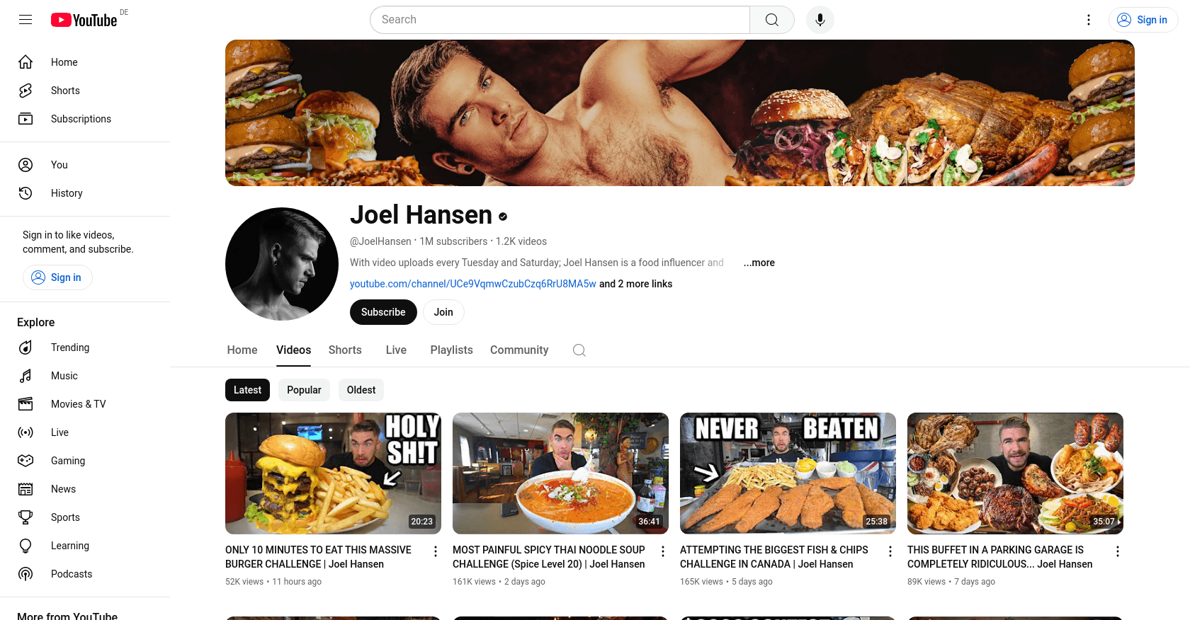 Joel Hansen's YouTube channel is a hub for food enthusiasts and competitive eating fans.