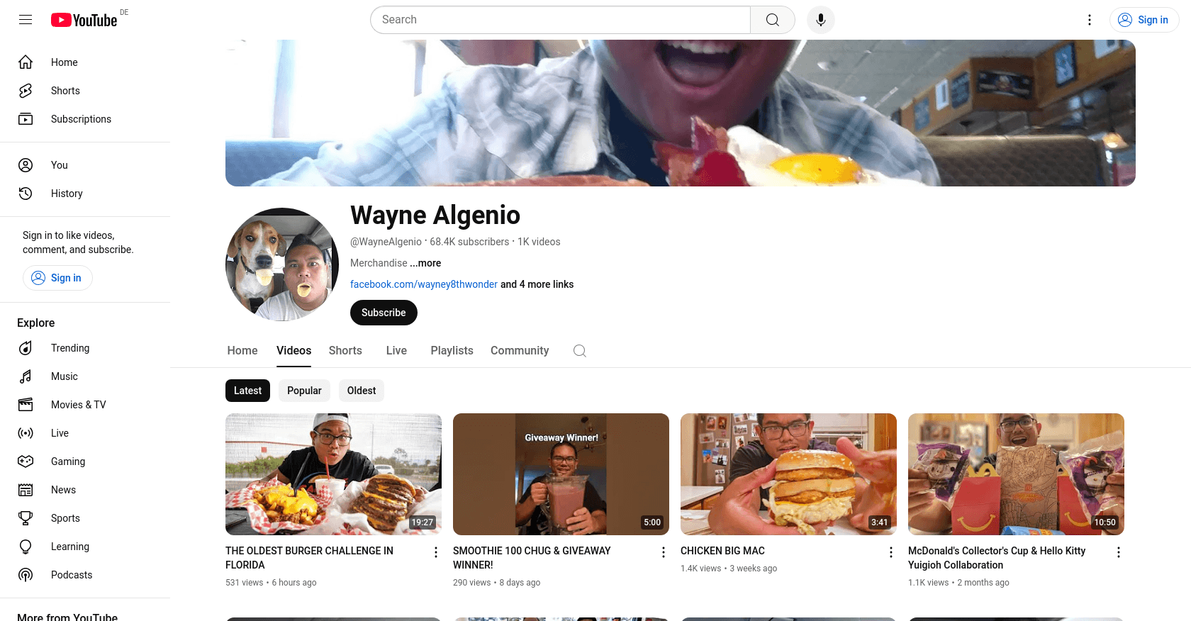 Wayne Algenio, known by his real name Wayne Algenio, is a YouTube content creator specializing in food challenges, food reviews, and eating contests. He joined YouTube on October 8, 2009, and has since built a channel with 68.4K subscribers and over 14.71 million total video views. For more about Wayne Algenio, visit his YouTube channel.