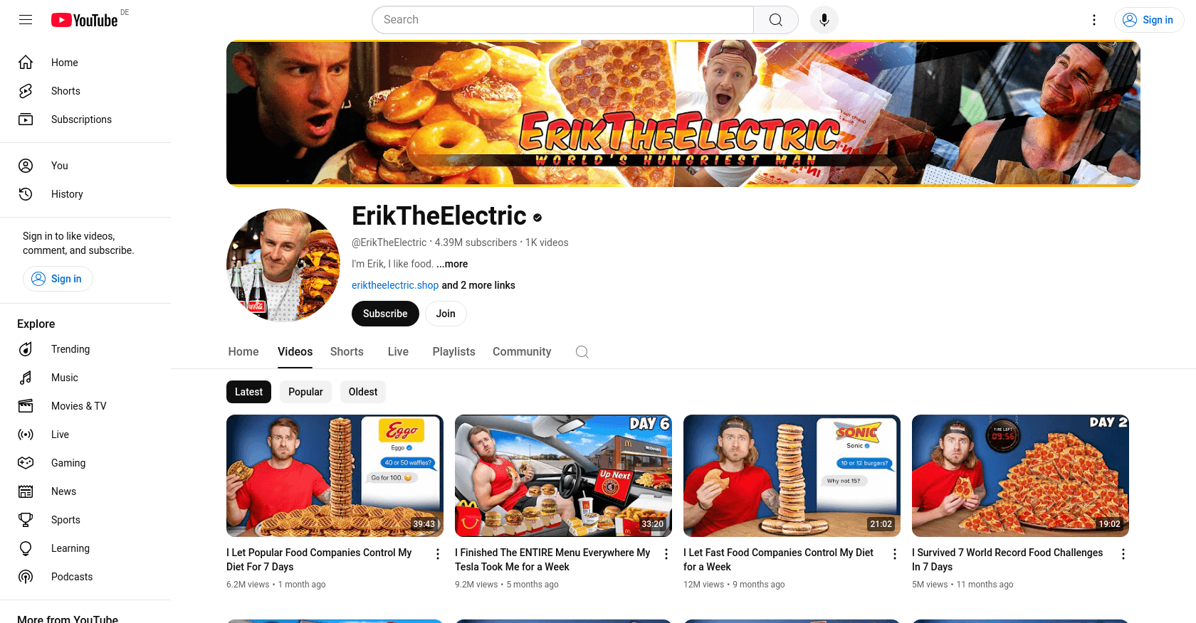 His content includes themed challenges, such as eating entire menus from fast food restaurants or surviving on the diets of famous personalities.