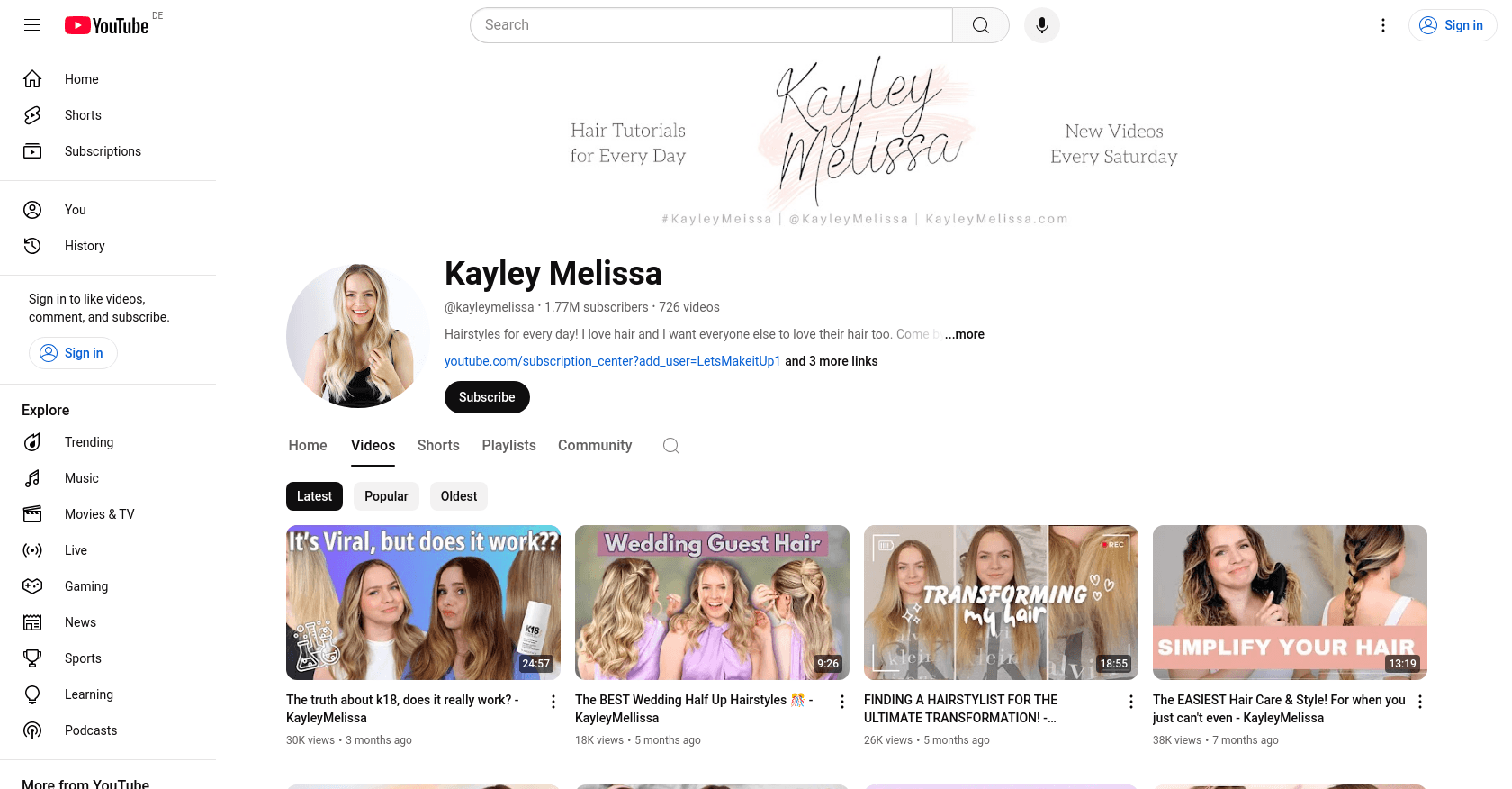 Kayley Melissa, a YouTube star known for her beauty and hair tutorial content, launched her channel on March 19, 2010. She focuses on creative, do-able hairstyles, character recreations, and general lifestyle and beauty. With over 1.77 million subscribers, Kayley Melissa has become a go-to source for hair enthusiasts looking for practical and stylish hair tips. You can explore more of her content on her YouTube channel.