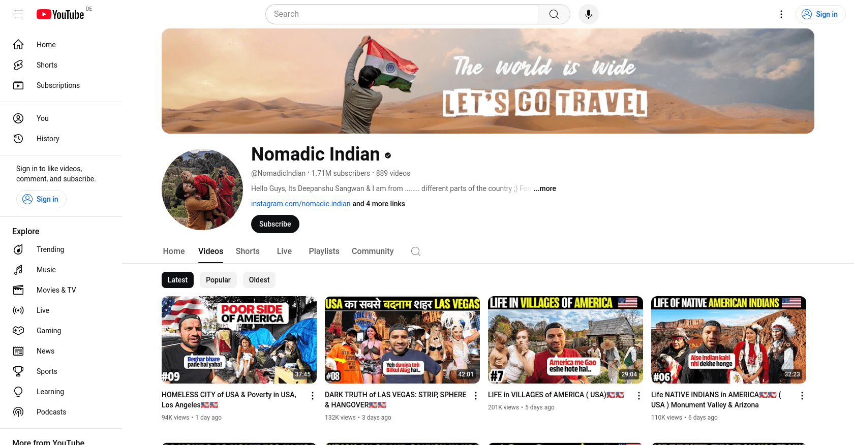 Nomadic Indian, whose real name is Deepanshu Sangwan, is a popular travel YouTuber known for his adventurous content. He joined YouTube on May 03, 2017, and has since captivated a large audience with his unique travel experiences. You can explore more of his content on his YouTube channel.