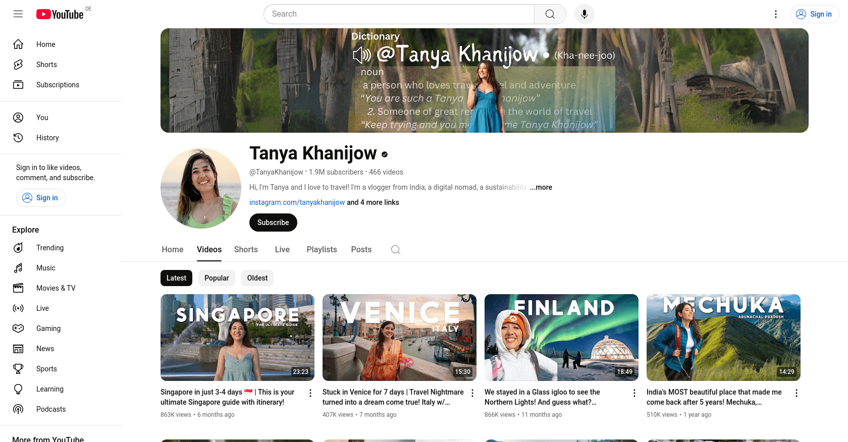 Tanya Khanijow, a renowned travel vlogger, launched her self-titled YouTube channel on October 07, 2012. With a focus on travel stories and sustainability, she has amassed over 1.91 million subscribers and 467 videos. You can explore more of her content on her YouTube channel.