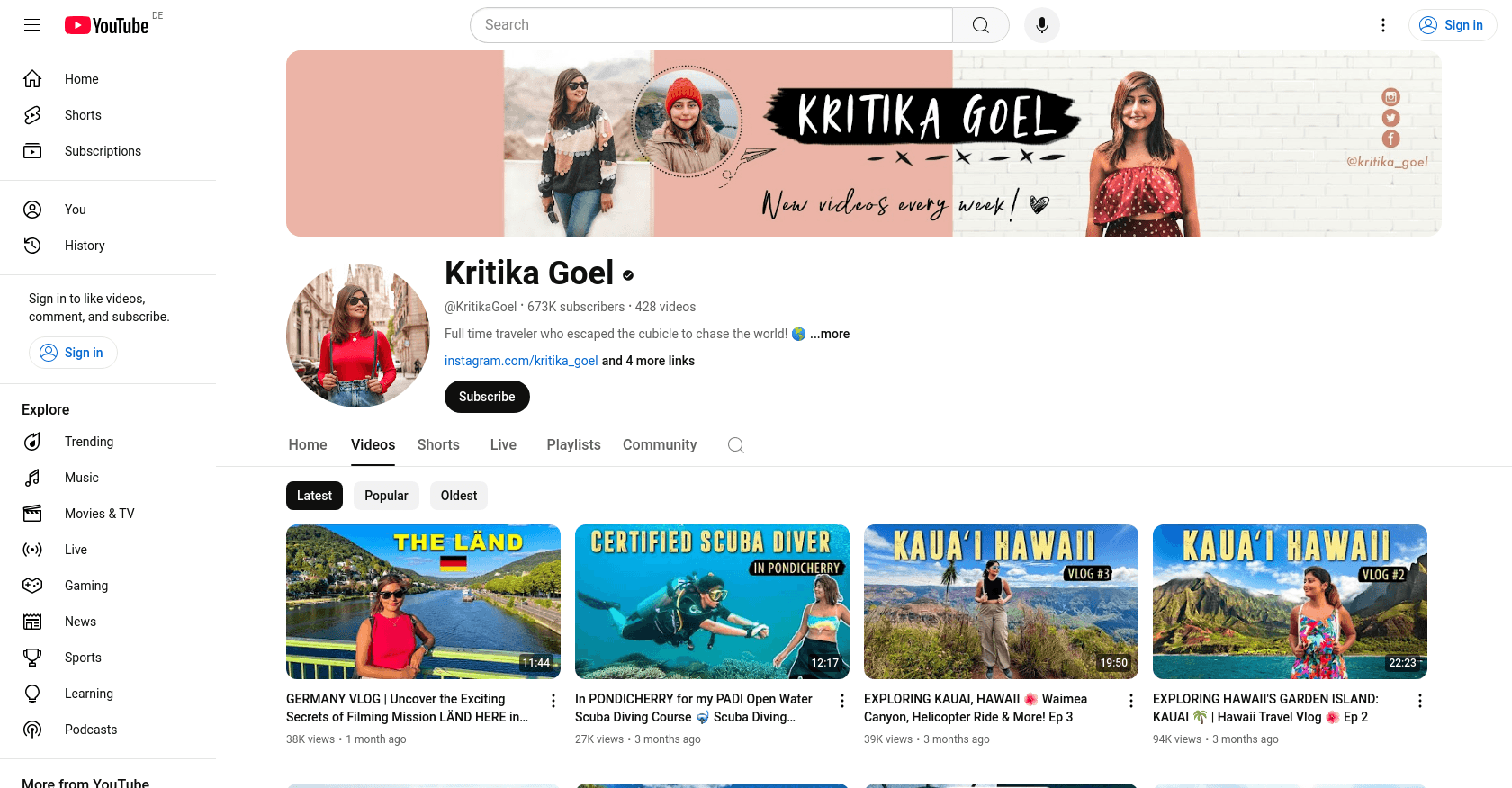 Kritika Goel creates detailed travel vlogs, documenting her experiences in various destinations such as Germany, Pondicherry, Hawaii, and Rishikesh.