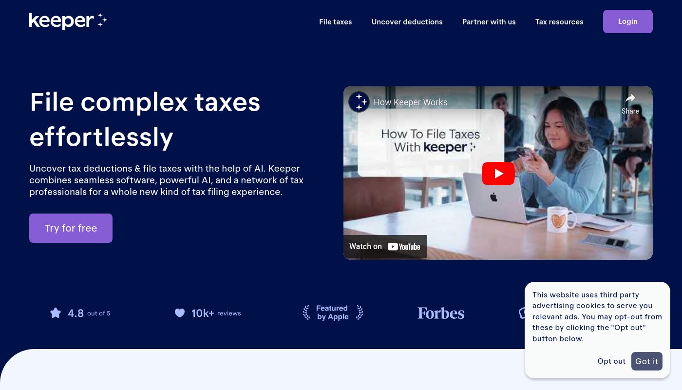 Keeper Tax is a tax filing software that helps users file complex taxes effortlessly. It identifies over 300 credits and deductions, offers various tax calculators, and provides access to 200+ tax guides and video tutorials. The software includes built-in expense tracking with categories, notes, and receipt photos. Additionally, Keeper Tax features an award-winning AI tax assistant and human tax professionals for support, ensuring every return is reviewed and signed by a tax professional.