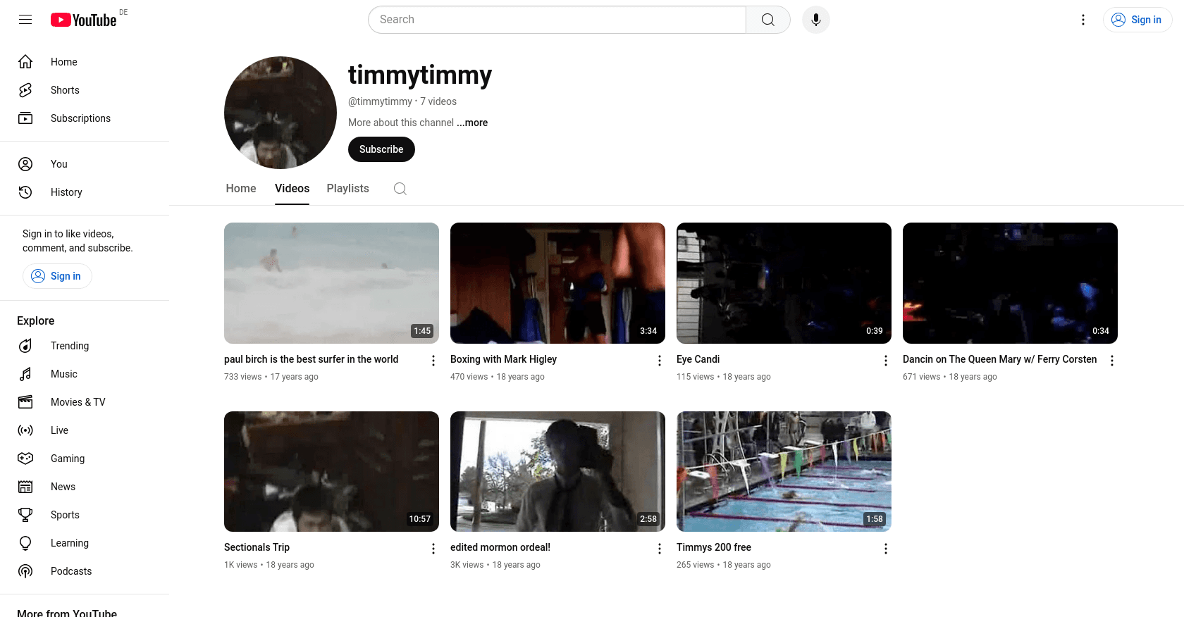 The audience that tends to watch Timmy Timmy's videos is primarily composed of individuals interested in surfing, boxing, and unique personal experiences. For instance, his viewers are likely to engage with videos like "paul birch is the best surfer in the world" which has 733 views, and "edited mormon ordeal!" which has garnered 3K views.