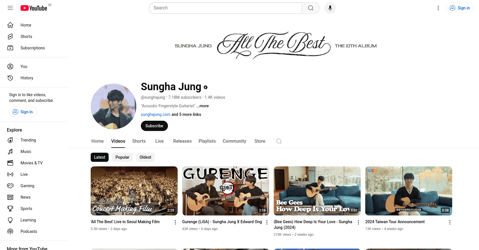Sungha Jung, whose real name is Jung Sungha, is a renowned acoustic fingerstyle guitarist known for his captivating YouTube performance videos. He joined the platform on September 9, 2006, and has since garnered over 7 million subscribers. For more about his content, visit his YouTube channel.