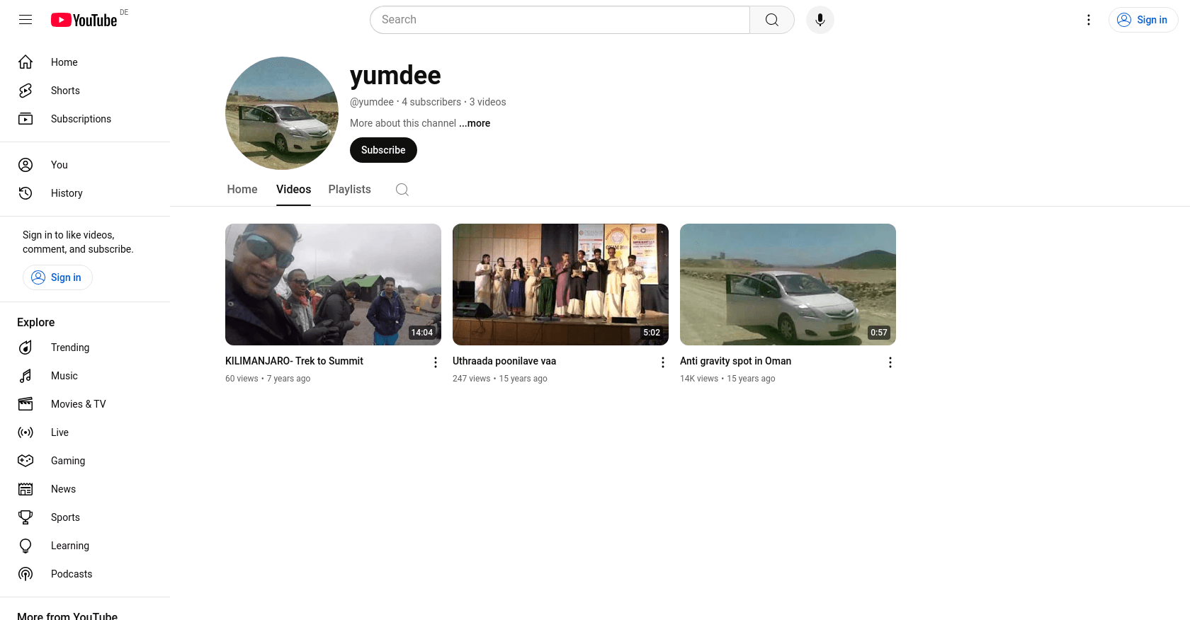 The audience that tends to watch YumDee's videos is primarily composed of travel enthusiasts and individuals interested in unique experiences. For instance, his viewers are likely to engage with videos like "KILIMANJARO- Trek to Summit" which has 60 views, and "Anti gravity spot in Oman" which has garnered 14K views.