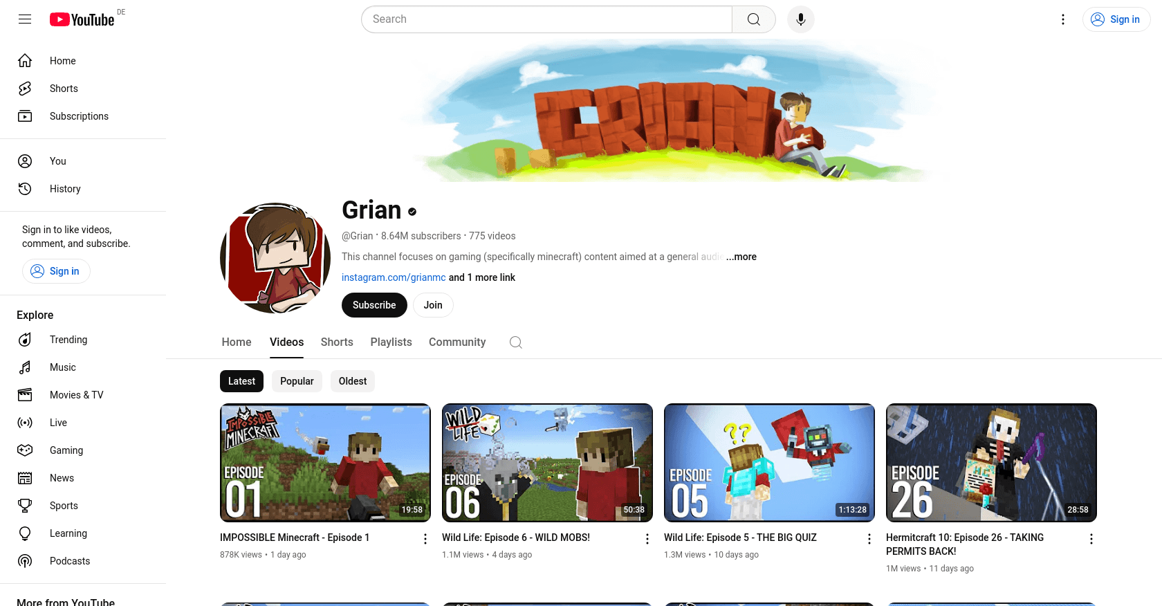 Grian's audience primarily consists of Minecraft enthusiasts, ranging from children to young adults, who are deeply engaged with creative building and gameplay content. For instance, his video "Hermitcraft 10: Episode 1 - THE START" has garnered over 5 million views, indicating a high level of interest and engagement among his fans.