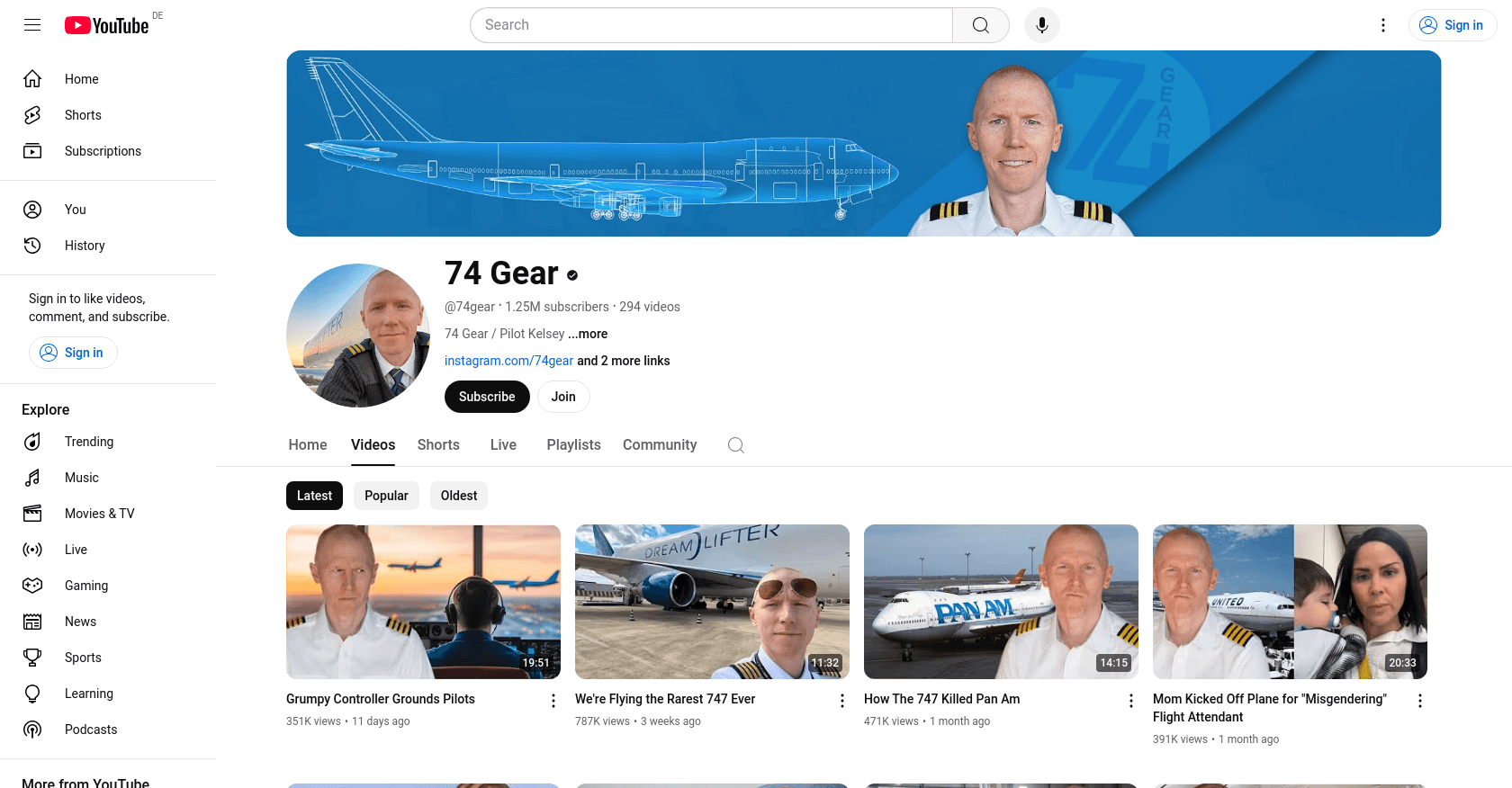 Using the YouTube platform, 74 Gear offers a variety of aviation-related content.