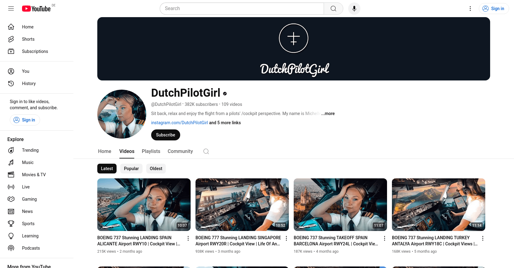 Michelle Gooris, known as DutchPilotGirl, is a professional airline pilot who joined YouTube on June 21, 2014. She shares her experiences and insights into the life of an airline pilot, offering viewers a unique cockpit perspective on flights, landings, and takeoffs. You can explore more of her content on DutchPilotGirl's YouTube Channel.