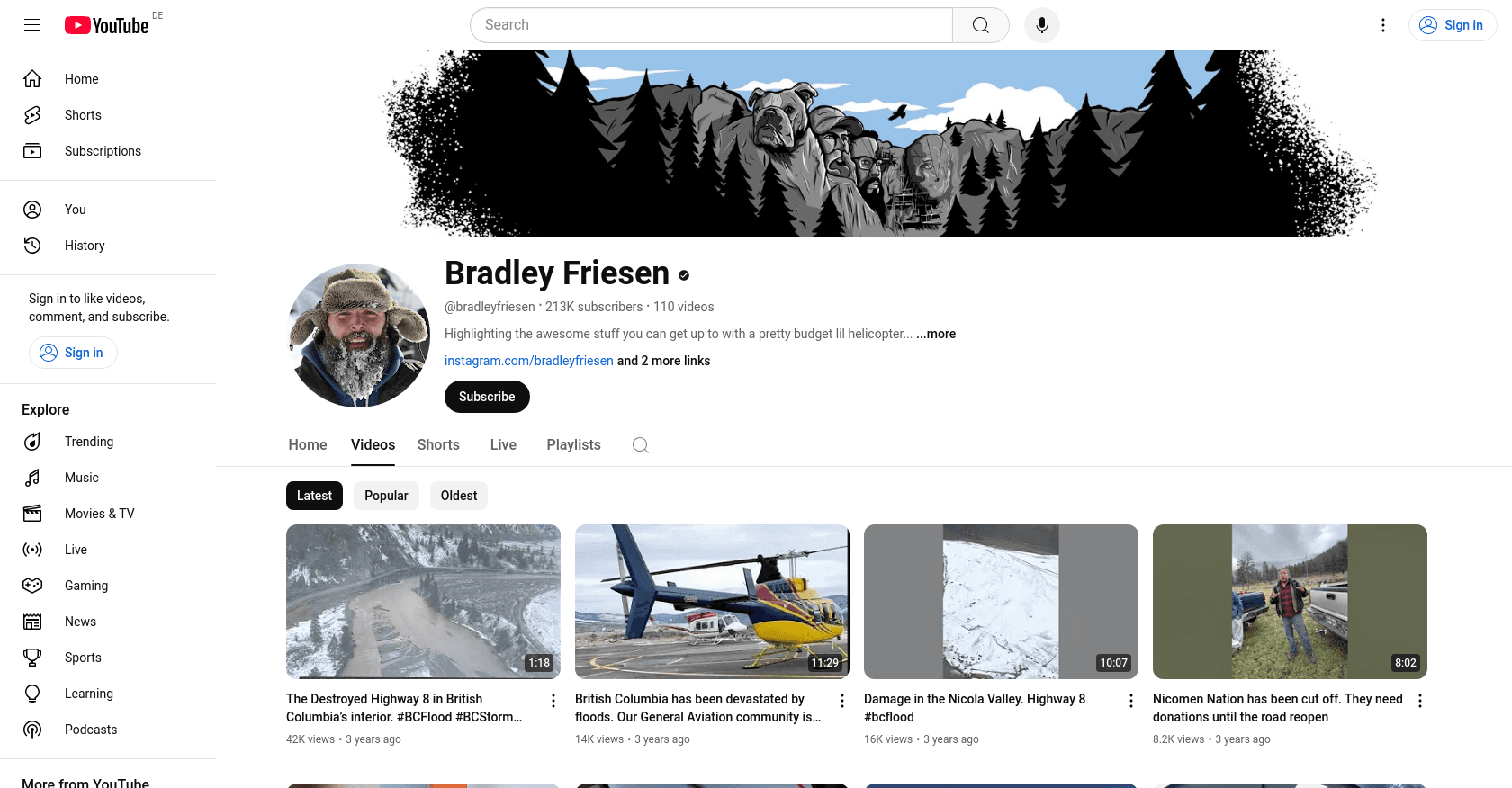 Bradley Friesen's YouTube channel offers thrilling helicopter adventures and stunning visuals.