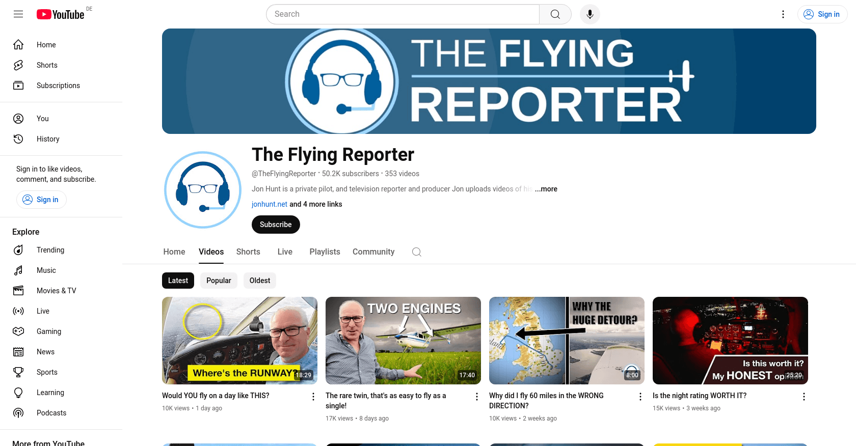 Jon Hunt, known as The Flying Reporter, is a private pilot and television reporter/producer who joined YouTube on September 2, 2011. His channel features a variety of content related to general aviation, including flying trips, special reports, and decision-making debriefs. You can explore more of his content on The Flying Reporter's YouTube Channel.