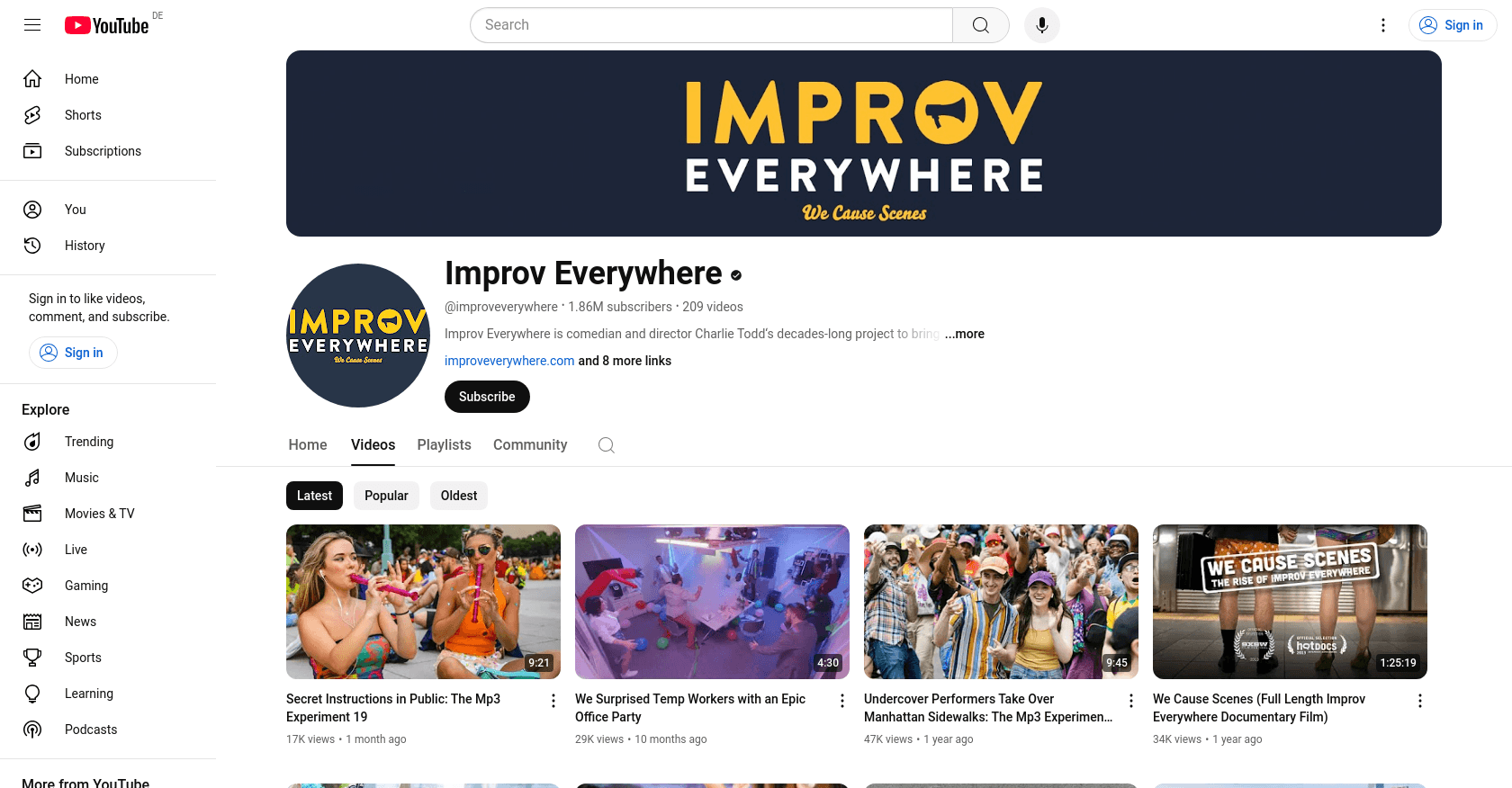 Improv Everywhere, founded by comedian and director Charlie Todd, is a group known for creating large-scale surprise public performances. They joined YouTube on April 14, 2006, and have since become famous for viral hits like "Frozen Grand Central" and "No Pants Subway Ride." You can explore more of their content on their YouTube channel.