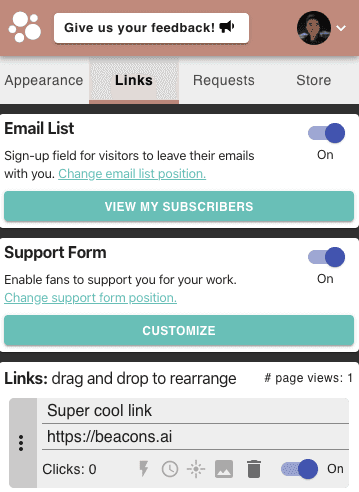 Enter the smart link. Rather than updating all of your links across all of your social media platforms, you can just update the one link on your Beacons page. When visitors come to your Beacons page, they will automatically get forwarded to that one selected link. As a bonus, we'll also track and report how many clicks you got 🥳