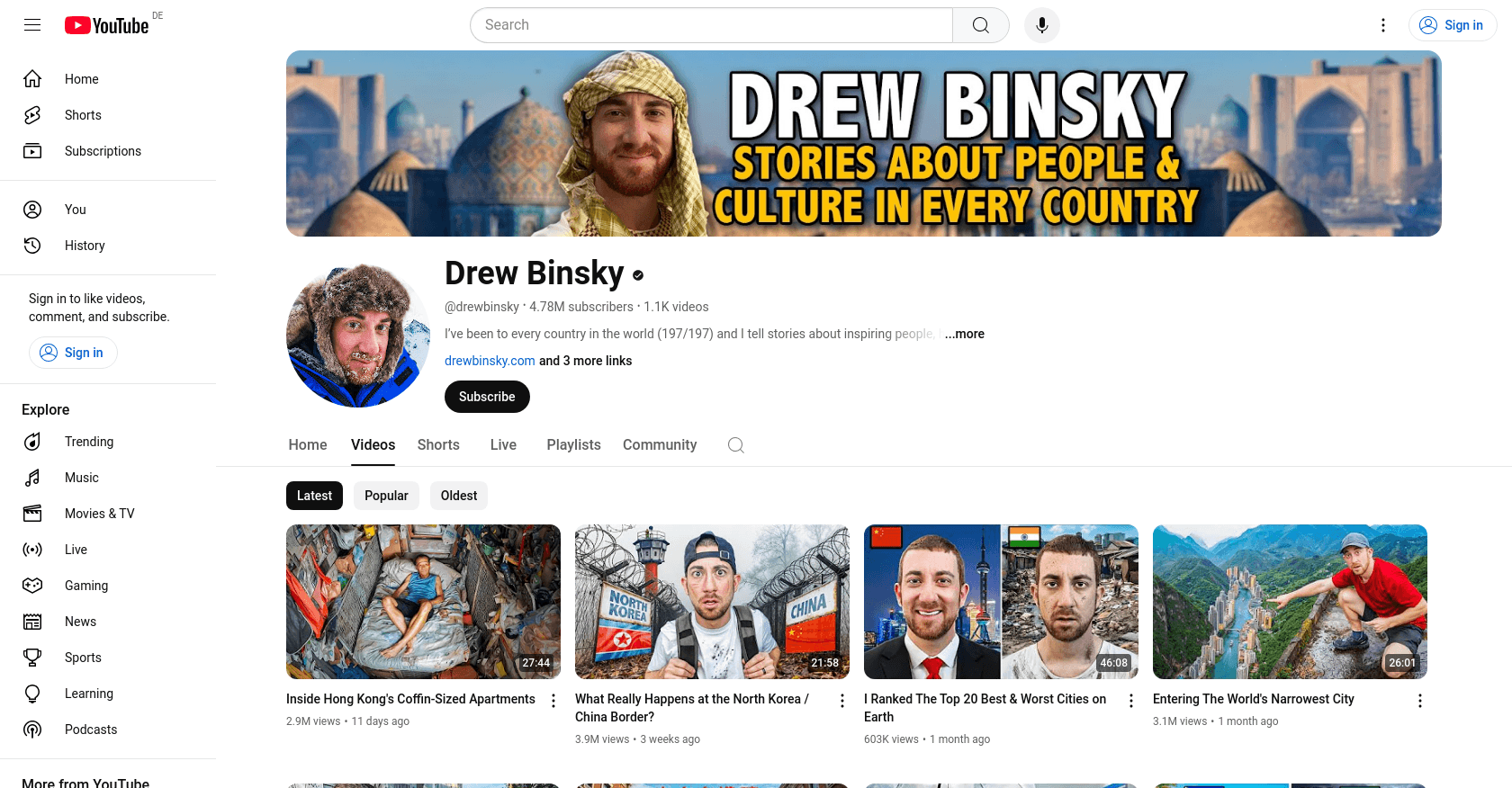 Drew Binsky, whose real name is Drew Goldberg, is a travel vlogger who has visited every country in the world. He joined YouTube on July 26, 2012, and has since captivated audiences with his stories about inspiring people, hidden cultures, and wild adventures. You can explore his journey on his YouTube channel.