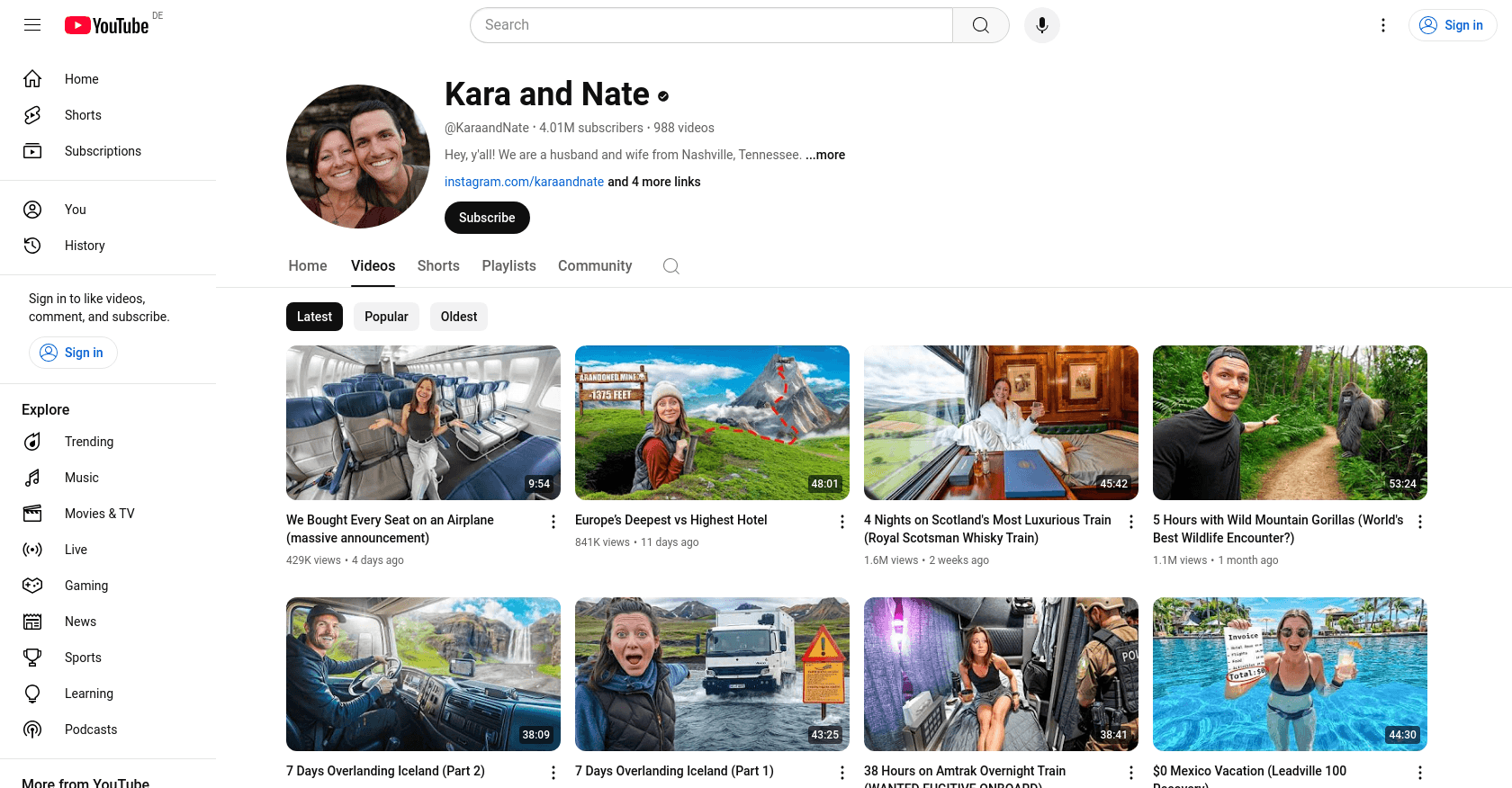 Kara and Nate's YouTube channel boasts impressive statistics that highlight their influence in the travel niche.