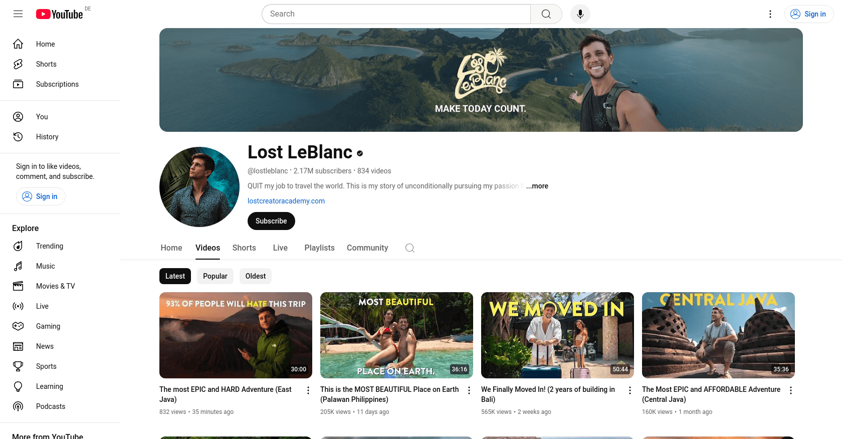Lost LeBlanc's audience primarily consists of young adults and middle-aged individuals who are passionate about travel, adventure, and the digital nomad lifestyle. For instance, his video "The Most EPIC and AFFORDABLE Adventure (Central Java)" attracts budget-conscious travelers, while "We Finally Moved In! (2 years of building in Bali)" appeals to viewers interested in long-term travel and expatriate living.